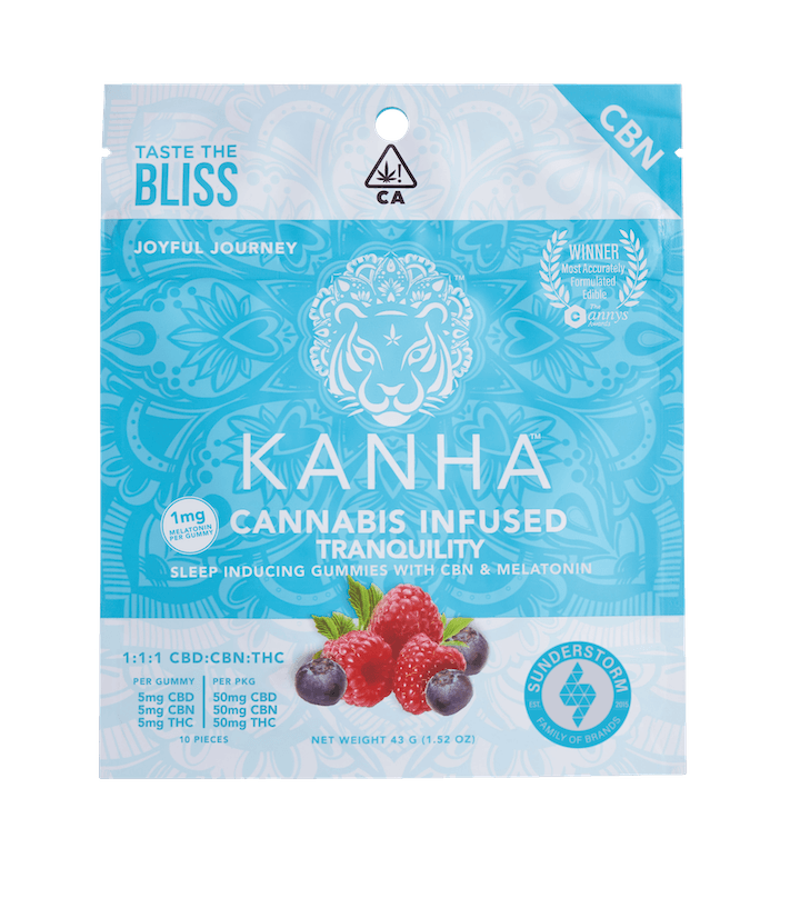 Perfect for medical patients and recreational consumers seeking chill vibes, Kanha 1:1:1 Tranquility CBD Gummies contain 50mg CBD, 50mg THC, and 50mg CBN per package, with 10 gummies per bag. Kanha gummies use all-natural ingredients, with zero artificial colorings or flavoring. Made using premium full-spectrum cannabis oil, these Blue Raspberry Tranquility gummies might provide gentle calm effects good for relaxing at night and helping promote sleep.
