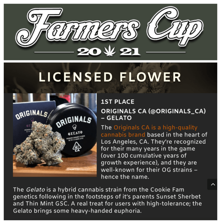 Revered by judges and consumers, alike, Originals’ award-winning Gelato strain is a champion. The strain took “Best Appearance” and First Place “People’s Choice Award” at the 2021 Farmer’s Cup. Some of the highest honors in California.